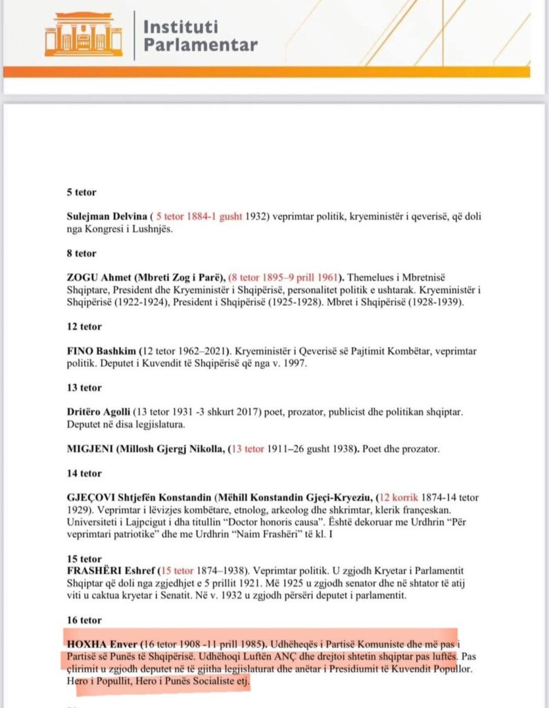 Në një akt të paprecedentë, Kuvendi i Shqipërisë prodhoi të premten një dokument zyrtar ku nderon mes figurave kombëtare edhe diktatorin Enver Hoxha, i cili udhëhoqi regjimin totalitar komunist për gati gjysmë shekulli, duke izoluar shqiptarët, shtypur të drejtat e njeriut dhe shkaktuar mijëra viktima.