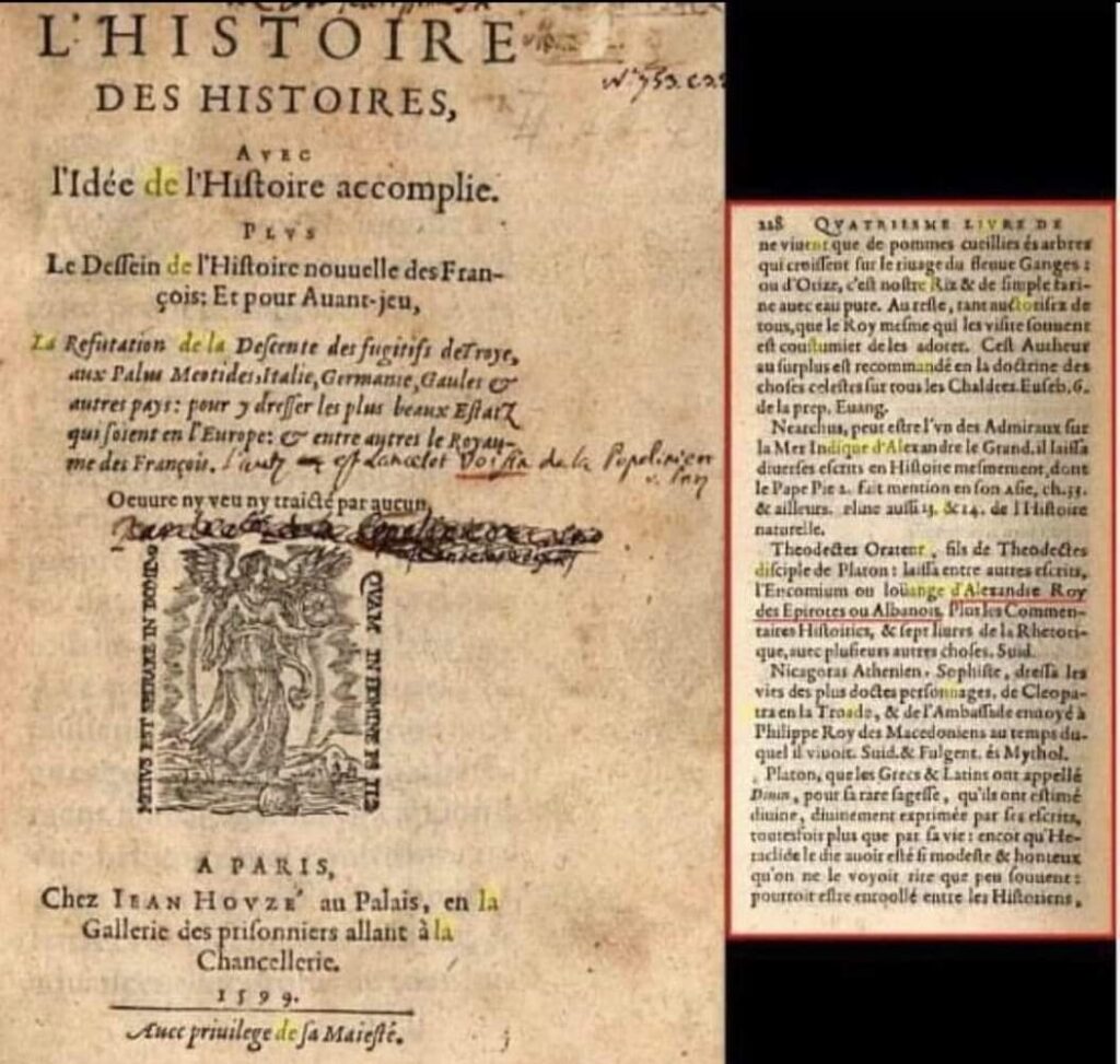 L’Histoire des Histoires (1599): Ky libër francez e quan mbretin e Epirit (trungu i Aleksandrit) si “Roy des Epirotes ou Albanois” (Mbret i Epirotëve ose Shqiptarëve), duke vërtetuar se identiteti i tyre nuk shihej si grek nga studiuesit e rilindjes evropiane.