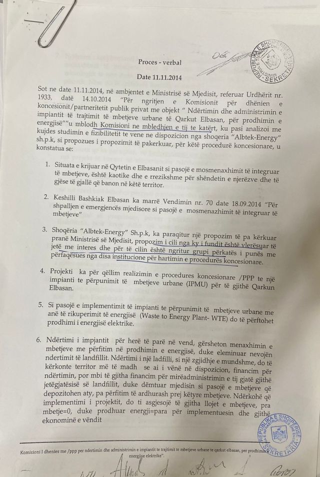 Procesverbali i datës 11 nëntor 2014 nga Komisioni për dhënien me Koncesion të Inceneratorit të Elbsanit tregon se kompania “Albtek Energy” ka bërë një kërkesë të pakërkuar të cilën Ministria e Mjedisit e vlerëson. Komisioni e sheh të vështirë operimin e tij për këtë ofertë ndaj i kërkon ndihmë kryeministrit për të rishikuar ai buxhetin e shtetit pasi përndryshe “nuk mund të zbatojë në kushtet e ndodhura dhe implementimi i projektit ka ndikim në buxhetin e shtetit”