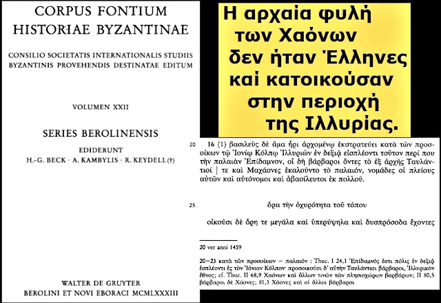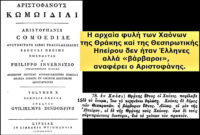 Nuk është vetëm Thukididi. Dokumenti (Scholia – Aristofani) e cilëson fisin e Kaonëve si një “ethnos barbar” (barbaron ethnos). Kjo dëshmon se edhe në perceptimin popullor të Athinës (përmes komedisë), banorët e Epirit verior shiheshin si të huaj.