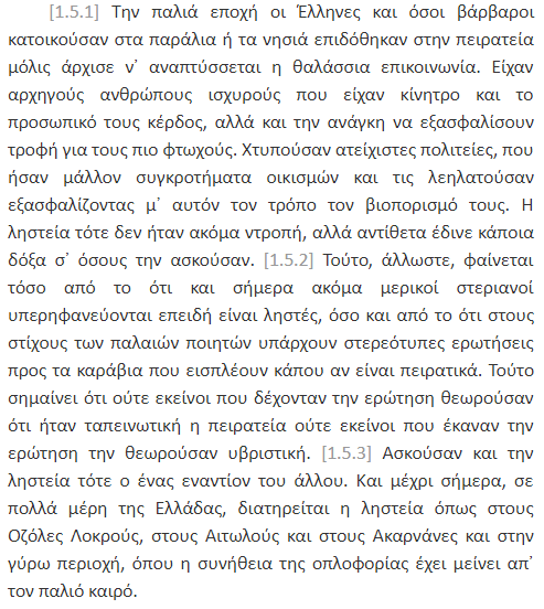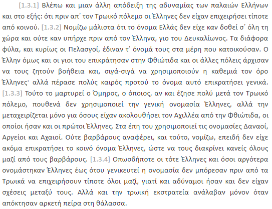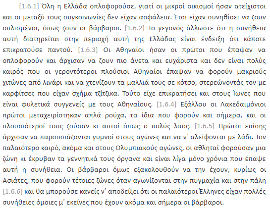 Thukididi, në librat e parë (1.5.1 dhe 1.6.1), bën një analizë sociologjike brilante (shih dokumentet poshte). Ai vëren se në kohët e vjetra, helenët jetonin saktësisht si “barbarët” e kohës së tij: