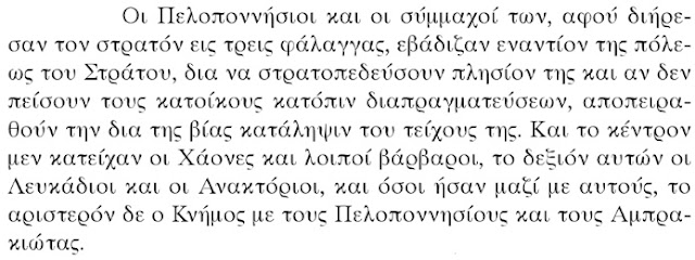 Në librin e dytë të “Historisë së Luftës së Peloponezit”, Thukididi bën një dallim kirurgjikal midis trupave që merrnin pjesë në ekspeditën kundër Stratosit. Dokumentet që shohim në përkthimet e Martin Hammond dhe S.T. Bloomfield konfirmojnë se: