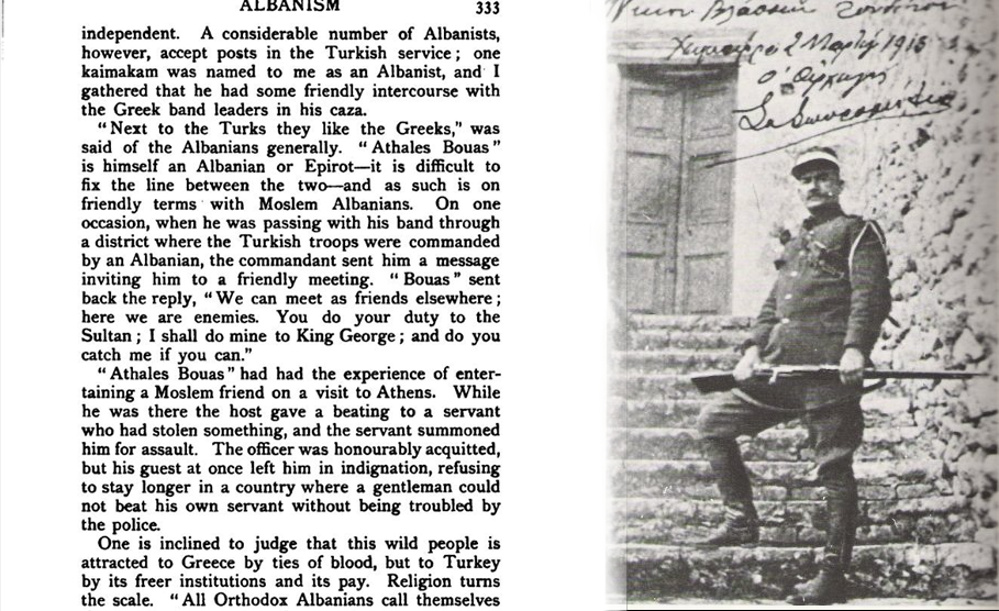“Athale Bouas” është vetë një shqiptar ose epirot – është e vështirë të përcaktohet kufiri mes të dyve – dhe si i tillë është në marrëdhënie miqësore me shqiptarët myslimanë. Në një rast, ndërsa po kalonte me grupin e tij në një rajon ku trupat turke komandoheshin nga një shqiptar, komandanti i dërgoi një mesazh duke e ftuar për një takim miqësor. “Bouas” i dërgoi përgjigje: