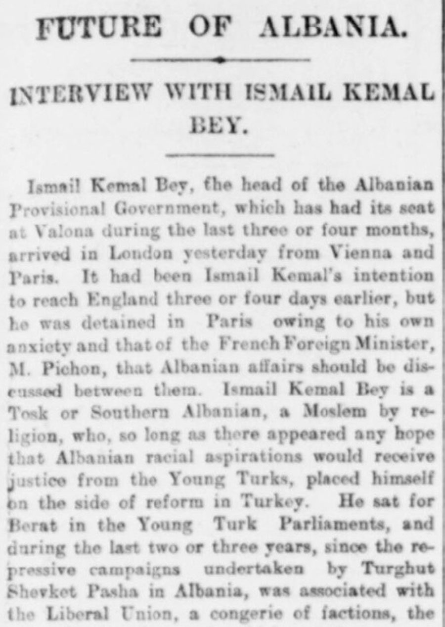 Ismail Bej Qemali, kreu i Qeverisë së Përkohshme Shqiptare, e cila ka pasur selinë në Vlorë gjatë tre-katër muajve të fundit, mbërriti dje në Londër nga Vjena dhe Parisi. Ismail Qemali synonte të arrinte në Angli tre-katër ditë më parë, por ai u ndalua në Paris për ankthin e tij dhe të ministrit të Jashtëm francez, z. Pichon, që çështjet shqiptare të diskutoheshin mes tyre. Ismail Bej Qemali është tosk, ose shqiptar i Jugut, mysliman nga feja. Për sa kohë që kishte ndonjë shpresë se Turqit e Rinj do t’u përgjigjeshin aspiratave racore të shqiptarëve, ai ishte i përkushtuar për reforma në Turqi. Ai përfaqësoi Beratin në parlamentet e Turqve të Rinj dhe për dy ose tre vitet e fundit, që nga fushatat e shtypjes së Turgut Shefqet Pashës në Shqipëri, ai ka qenë i lidhur me Unionin Liberal, një konglomerat fraksionesh, elementi i vetëm i të cilëve ishte urrejtja e përbashkët e të gjithë anëtarëve të tij për tiraninë e Turqve të Rinj. Ismail Bej Qemali ishte i lidhur ngushtë me Qamil Pashën, madje kohët e fundit, në prag të disfatës turke në Thrakë (Trakë), ishte në negociata me Vezirin e Madh të atëhershëm për t’i siguruar Shqipërisë të drejtën e lirë për t’u zhvilluar sipas kufijve të saj nën sundimin turk.
