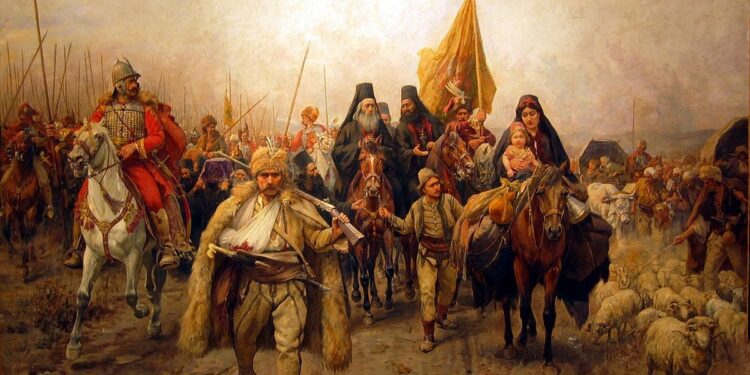 Migrimi i serbëve (Seoba Srba), nga Paja Jovanović, portretizon Patriarkun serb Arsenije III Čarnojević, i rrethuar nga ushtarë, kope delesh dhe gra me foshnja, duke udhëhequr (supozohet) rreth 36,000 familje nga selia e tij në Pejë, në atë që sot është Vojvodina, pas dështimit të një revolte (të supozuar) serbe.
