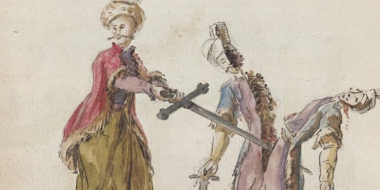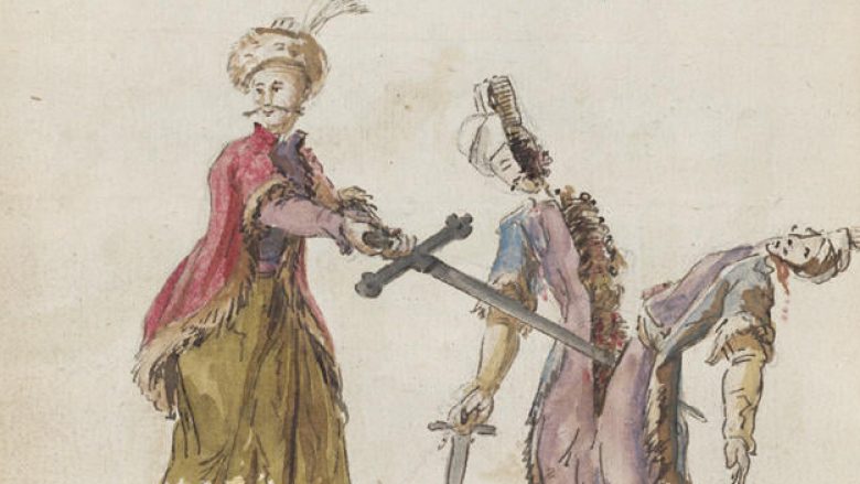 Në vizatimin me diçiturë “Zbavitjet e gëzueshme të Skënderbeut mbret i Arbërisë pasi ka marrë Krujën nën Turqit” (“Les joyeux passetems de Scanderbeg roy d’Albanie après avoir repris Croya sous les Turcs”) ai, me shpatën që e mban me të dyja duart, pasi ka vrarë një armik, është kthyer dhe po çan dysh armikun tjetër.