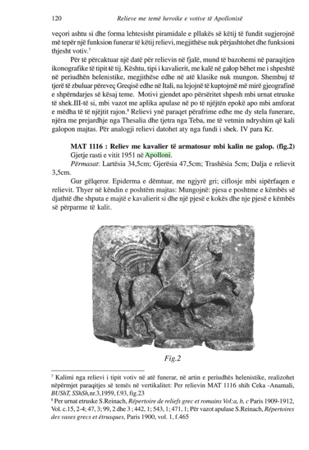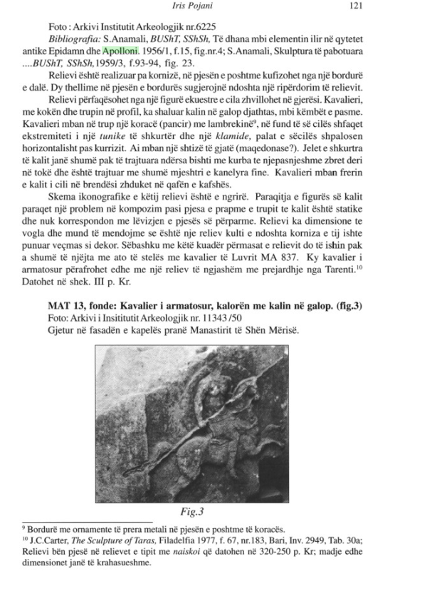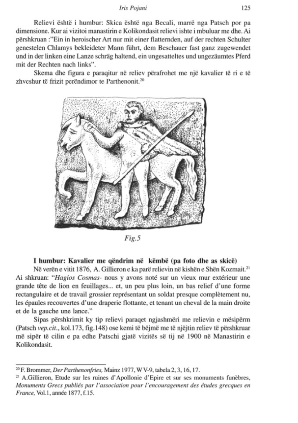 Dokumentacioni i Iris Pojanit mbi relievet e Apollonisë sjell në dritë raste flagrante të kësaj humbjeje. Një prej tyre është Kavalieri me qëndrim në këmbë (Fig. 5), dikur pjesë e Manastirit të Kolkondasit. Sot, ky relief nuk ekziston më fizikisht. Ne e njohim atë vetëm përmes një skice të Becali-t, të marrë nga Patsch në vitin 1904. Ky objekt, që paraqiste një burrë në pozicion heroik me një kalë pa shalë, ishte një urë lidhëse mes artit të frizit të Partenonit dhe realitetit vendas apolloniat.