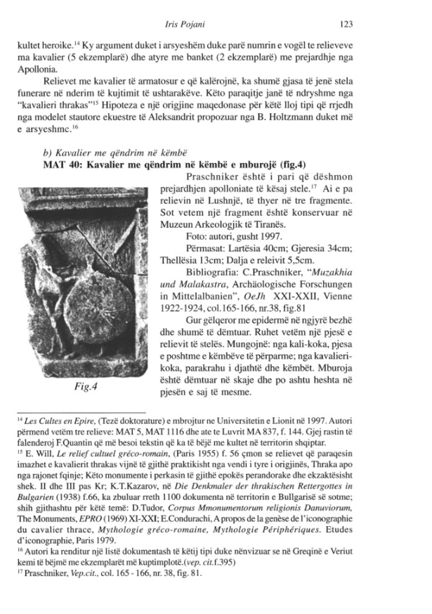 - Pojani, Iris. “Relievet me temë heroike dhe votive të Apollonisë”. Publikuar në revistën shkencore ILIRIA, Nr. 1-2, viti 2001-2002 (f. 120-126).