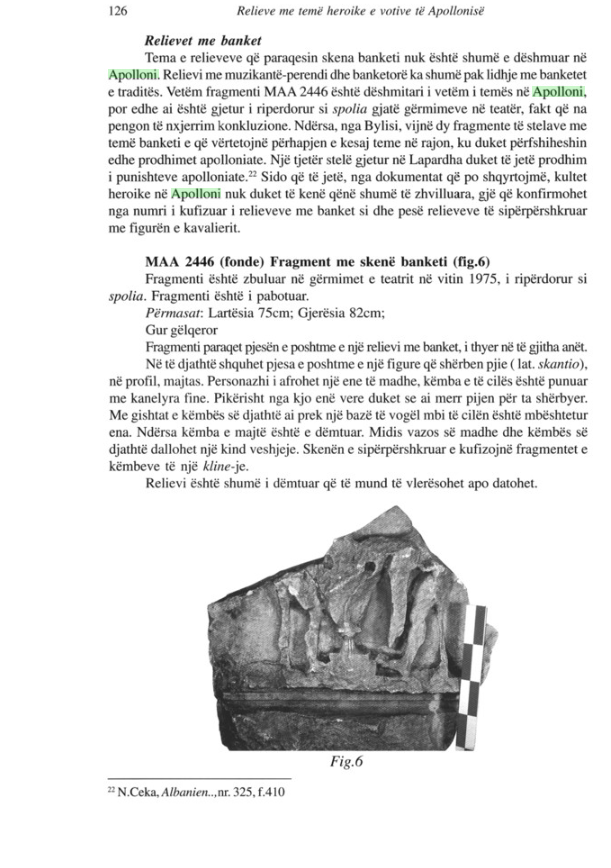 Një fenomen tjetër që dëshmojnë dokumentet është përdorimi i objekteve arkeologjike si spolia (material ndërtimi i ripërdorur). Fragmenti i skenës së banketit (Fig. 6, MAA 2446), i gjetur në teatrin e Apollonisë, ishte ripërdorur si thjesht një gur ndërtimi. Kjo tregon një shkëputje brutale mes vlerës fillestare sakrale të objektit dhe trajtimit të tij të mëvonshëm.