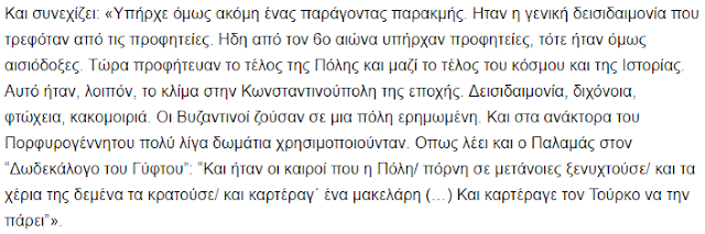 Ahrweiler eksploron edhe anën psikologjike të fundit të Bizantit. Ajo flet për një klimë supersticioni, varfërie dhe pesimizmi që kishte pushtuar Qytetin (Dokumenti 4). Profecitë që dikur ishin optimiste, tashmë parashikonin fundin e botës.