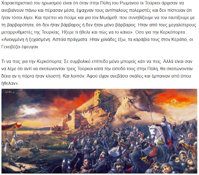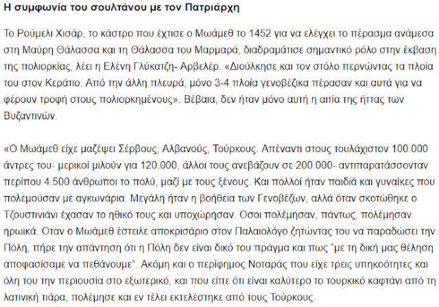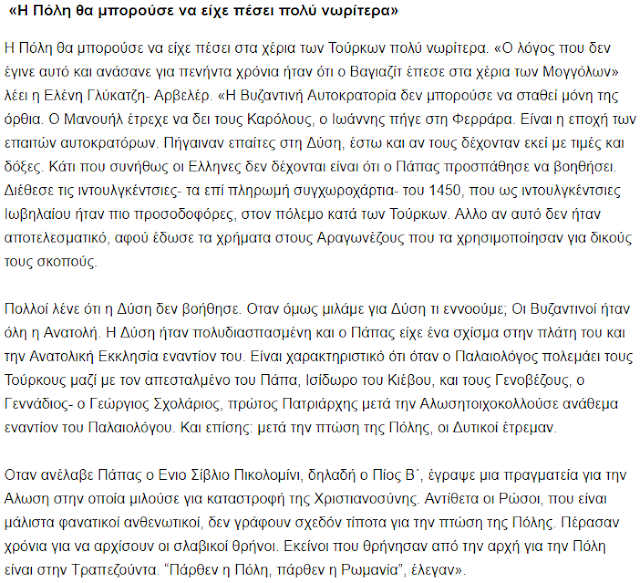 Në shekullin XV, këto zona ishin shtëpia e madhe shqiptare (arvanite). Duke pranuar se ushtria mbrojtëse ishte një mozaik “bizantinësh, italianësh dhe trupash nga provincat”, Ahrweiler la hapur derën për një lexim më të drejtë të historisë: mbrojtja e qytetit ishte edhe një mbrojtje e shqiptarëve që kishin lidhur fatin e tyre me perandorinë e perënduar.