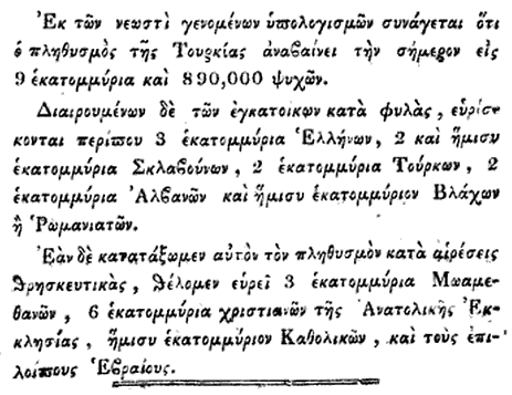2. Geniki Efimeris tis Ellados. Botimi i 9 janarit 1829, Egjinë. Dokumenti nr. 8 dhe 9 mbi llogaritjet e popullsisë në territoret e kohës: 3 milionë helenë, 2 milionë shqiptarë, 2 milionë turq, 2.5 milionë sllavë.