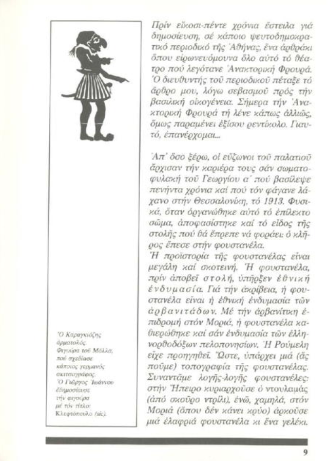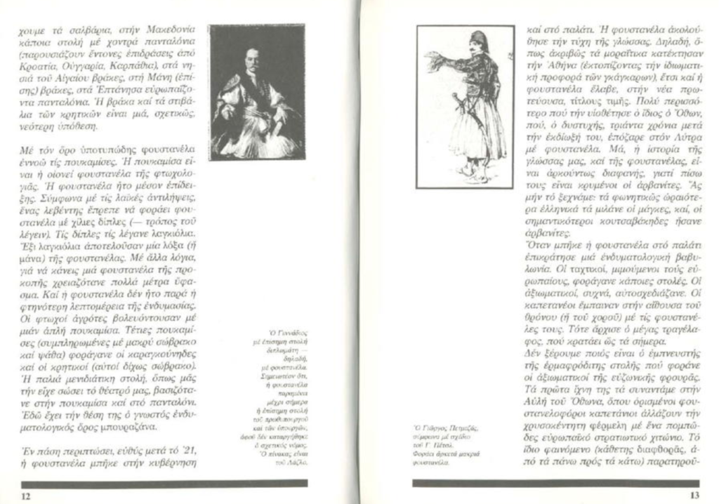 Në faqen 13, ai e cilëson këtë si një akt të mirëfilltë rrëmbimi: “Siç thashë, fustanella është produkt vjedhjeje.” Ky transformim nuk erdhi pa ndryshime. Për të krijuar “Gardën Mbretërore” (Evzonët), elita greke e asaj kohe, e ndikuar nga modelet evropiane (si anglezët dhe korpusi Brunswick Black), e standardizoi fustanellën, duke i dhënë asaj një pamje artificiale dhe pompoze që ndryshonte nga varianti origjinal arvanitas.