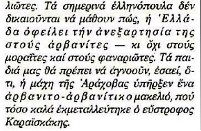 Autori vëren me ironi se edhe vetë “pastërtia” e gjuhës greke që dëgjohej në rrugët e Athinës ishte e ndikuar nga ky element. Ai përmend se “mangët” (rrugaçët e vjetër dhe rebelët urbanë të Athinës) flisnin greqishten më të bukur fonetikisht, pikërisht sepse ishin me origjinë arvanitase. Ky paradoks tregon se arvanitasit nuk dhanë vetëm gjakun për pavarësinë, por edhe formën estetike dhe gjuhësore të shtetit që më vonë do t’i mohonte.
