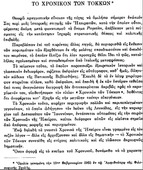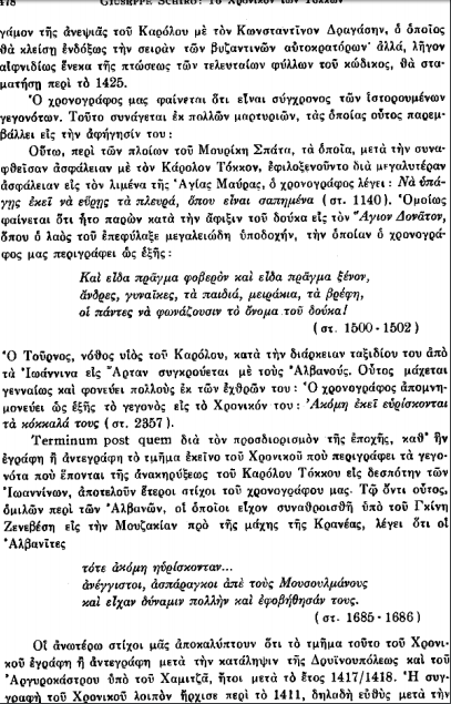 Zbulimi i këtij dorëshkrimi anonim në Bibliotekën e Vatikanit, i analizuar mjeshtërisht nga Zef Skiroi – Giuseppe Schirò, hodhi dritë mbi një periudhë “të errët” të historisë mesjetare. E shkruar në vargje politike (pesëmbëdhjetërrokësh) dhe në një gjuhë demotike (popullore) të pastër, Kronika përshkruan ngritjen e Karlo I Tokos, duka i Lefkadës, drejt zotërimit të Despotatit të Janinës dhe Artës.
