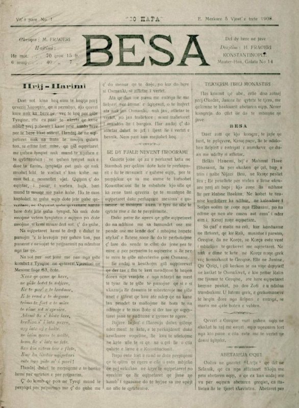 Gazeta Besa – 5/XI/1908 Shkrojtës M. Frashëri; Drejtor: H. Frashëri – Konstantinopole Mazlum-Han, Galata No 14”