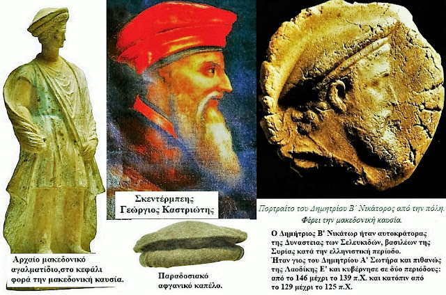 Kjo ngjashmëri shtrihet edhe te Kausia, kapele tipike e maqedonasve të lashtë dhe e mbretit Seleukid, Demetrius II Nicator. Eshtë tronditëse të shohësh se si kjo formë ka udhëtuar deri në Afganistan (si pakol) dhe është ruajtur në portretet e Gjergj Kastriotit, duke dëshmuar një hapësirë kulturore që lidh Epirin, Maqedoninë dhe Ilirinë me skajet më të largëta të botës që e quajtën helenistike.