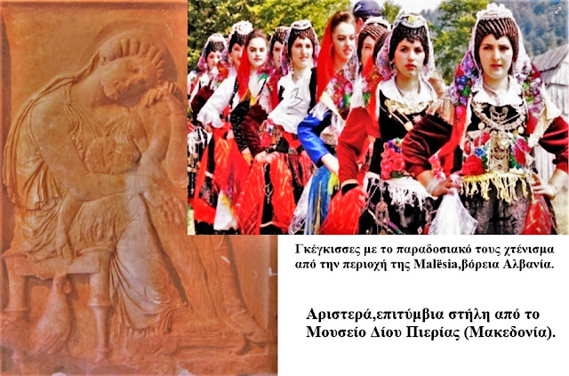 Nuk janë vetëm burrat bartës të kësaj vazhdimësie. Imazhet krahasuese midis një stele varrimi nga Dioni i Pierisë (Maqedoni) dhe grave nga Malësia e Madhe tregojnë një përputhshmëri mahnitëse në modelin e flokëve dhe veshjen tradicionale. Kjo “morfologji e traditës” tregon se kultura popullore shqiptare nuk është një krijim i vonë, por një fosile e gjallë e antikitetit ballkanik.