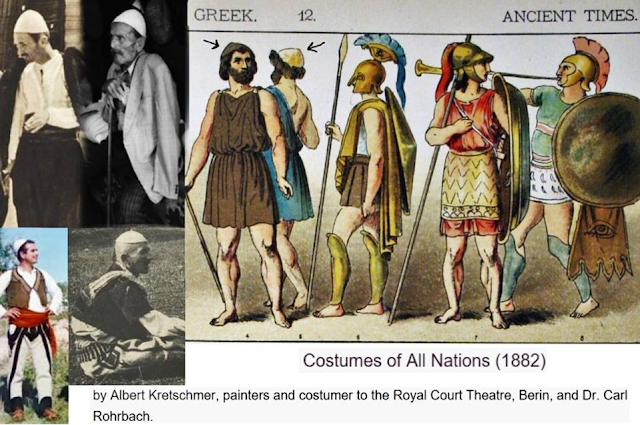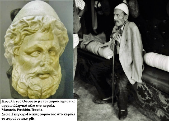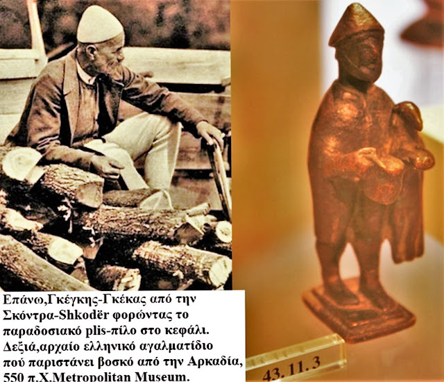 Dëshmia më e pakontestueshme e vazhdimësisë mijëvjeçare është ajo që njerëzit mbajnë mbi kokë. Plisi (apo pilos në greqishten e vjetër) dhe Kausia maqedonase janë simbole të gjalla. Një statujë e lashtë arkadike e vitit 550 p.K. paraqet një bari me një kapele identike me plisin që mban sot një malësor nga Shkodra. Po ashtu, portreti i Odisesë në muzeun Pushkin tregon heroin me të njëjtin plis që mban plaku gegë në ditët tona.