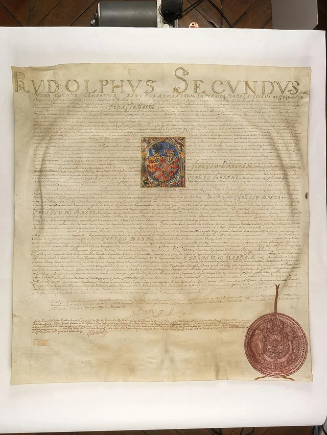 Dokumenti i nënshkruar nga Rudolf II, i pajisur me stemën heraldike dhe vulën perandorake, kishte funksionin e një konfirmimi të titujve dhe privilegjeve të Bastës. Këto karta u jepeshin vetëm personaliteteve të jashtëzakonshme që kishin shërbyer me besnikëri dhe sukses Perandorisë.