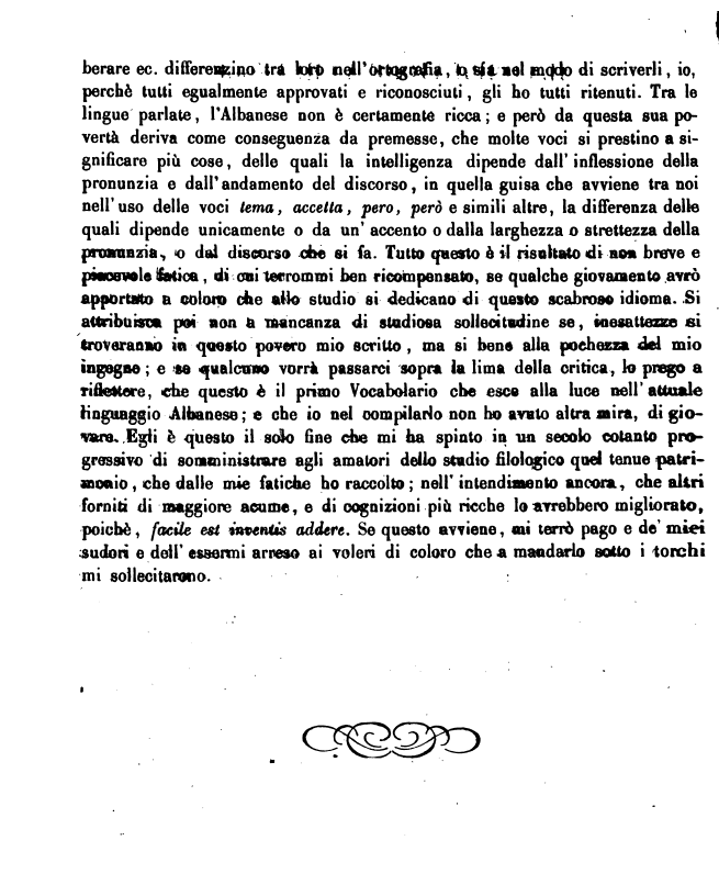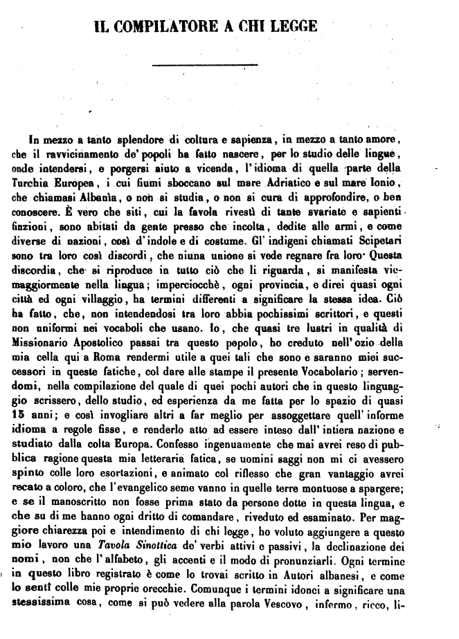 Në parathënien e tij “Il compilatore a chi legge”, Rossi shkruan se kjo popullsi, e cila banon “në pjesën e Europës Turke, fushat e së cilës derdhen në Adriatik dhe në Jon”, është ajo që quhet Albania. Ai shpreh keqardhje që gjuha e saj nuk studiohet dhe se “as nuk kujdesen ta thellojnë apo njohin mirë”. Për misionarin italian, kjo gjuhë është një pasuri e lënë pas dore nga dijetarët evropianë, ndonëse ajo përfaqëson një trashëgimi të lashtë të kulturës epirote. Rossi pohon se qëllimi i tij ishte “të ndihmojë për ta bërë këtë gjuhë të kuptueshme nga e gjithë Europa”, duke treguar qartë se Epirotishtja dhe Shqipja ishin sinonime në konceptin e tij shkencor.
