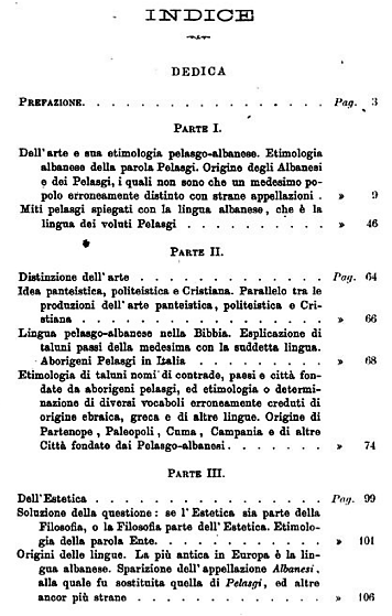 Struktura e veprës, siç zbulohet nga treguesi i lëndës (Indice), është një përpjekje sistematike për të rishkruar historinë e antikitetit përmes etimologjisë shqipe.