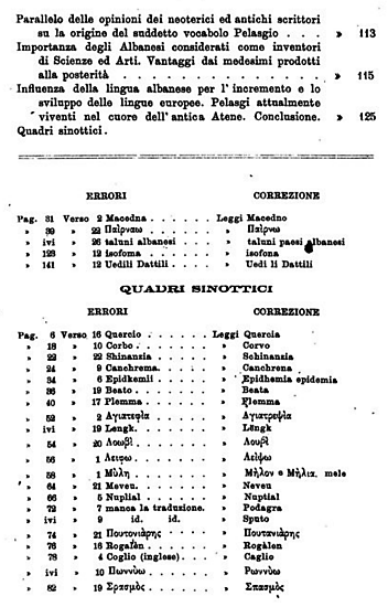 Në seksionin e “Errata-Corrige” (Korrigjime), ne shohim metodologjinë e tij të imët. Ai korrigjon terma për t’i përafruar më saktë me rrënjët shqipe. Për shembull, ai saktëson fjalën “Myli” në “Mylon o Mylia” (që lidhet me fjalën mollë – mele), apo korrigjimet fonetike si “Kragl” (Kral) dhe “Vatzer” (Vajzë), duke treguar një njohje të thellë të dialekteve dhe fonetikës shqipe.