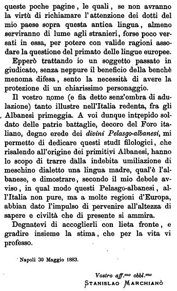 Hyrja e librit është një dokument politik po aq sa kulturor. Marchianò ia dedikon veprën e tij “Të Shquarit Shkëlqesi, Komandant Francesco Crispi” (Françesk Krispi, Kryeministrit të Italisë me origjinë arbëreshe). Në dedikim, autori shpreh dhimbjen dhe revoltën e tij ndaj “gjykimit të rëndë të dhënë nga shkrimtarë eminentë të etnografisë”, të cilët e kishin klasifikuar gjuhën shqipe si një “dialekt të idiomës greke”.