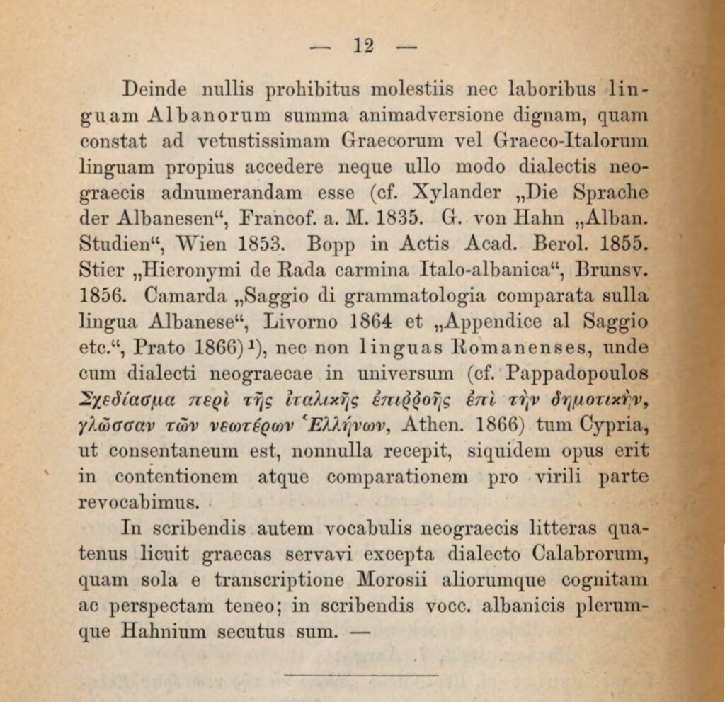 “Më pas, pa asnjë pengesë apo përpjekje, gjuha e shqiptarëve është e denjë për konsideratën më të lartë, pasi dihet se i afrohet më shumë gjuhës më të vjetër greke ose greko-italiane dhe nuk mund të renditet në asnjë mënyrë ndër dialektet neogreke.”