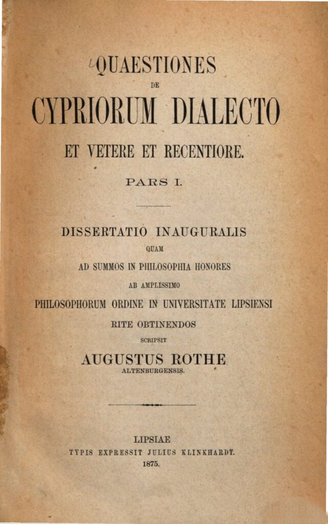 Një ndër dëshmitë më të rëndësishme për këtë vlerësim vjen nga Disertacioni Inaugurues i Augustus Rothe, botuar në Universitetin e Leipzigut në vitin 1875, me titull “Quaestiones de Cypriorum Dialecto et Vetere et Recentiore” (“Çështje mbi dialektin qipriot, të vjetrin dhe më të riun”).