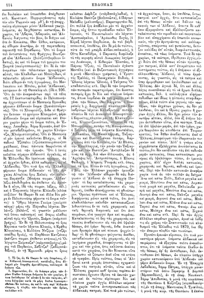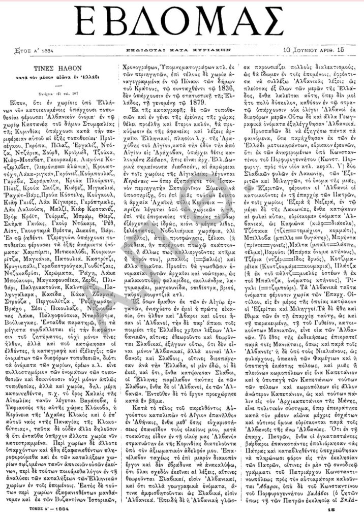 Revista prestigjioze athinase “ΕΒΔΟΜΑΣ” (Java), në botimin e saj të 10 qershorit 1884, publikon një studim të hollësishëm që shërben si një “certifikatë pronësie” gjuhësore dhe kulturore mbi territorin e sotëm grek. Ky dokument, së bashku me veprat e historianëve si Friedrich Thiersch, rrëzon mitet moderne dhe na kthen te një realitet ku “Palikari”, “Fustanella” dhe “Gjakmarrja” ishin emëruesit e përbashkët të një popullsie që fliste shqip.