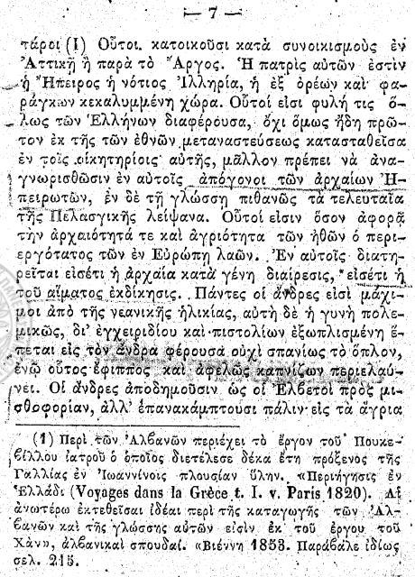 Arkivat nuk lënë vend për dyshim as mbi origjinën. Shqiptarët ose “Skipetarët” shihen si pasardhës të drejtpërdrejtë të Epirit antik dhe Ilirisë së Jugut, duke ruajtur mbetjet e fundit të gjuhës Pellazgjike. Ky qëndrim i shkencës greke të shekullit XIX tregon një respekt për lashtësinë e shqiptarëve që sot, për fat të keq, është zëvendësuar me mohim.
