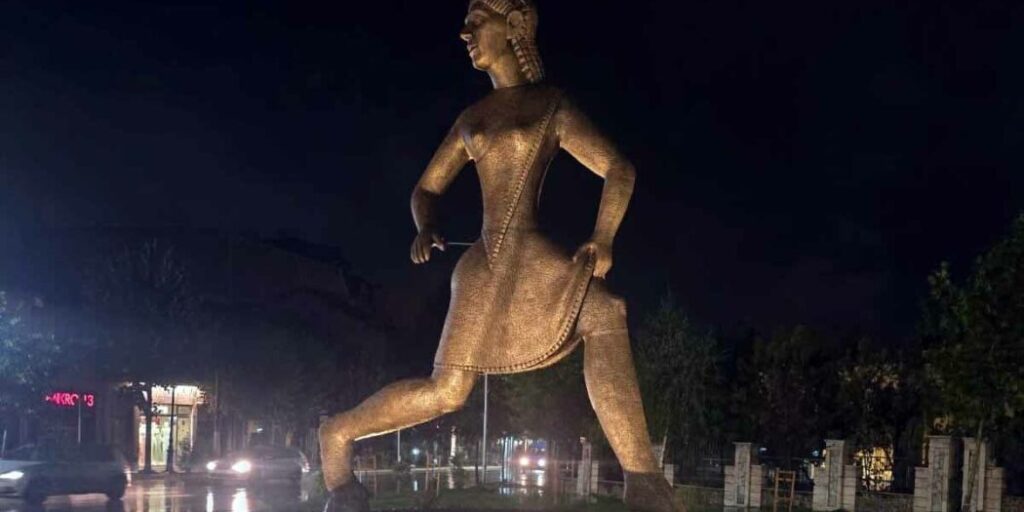 Arti tejkalon origjinalitetin i jep hijeshi, ritëm dhe bukuri. Shpirti i artistit vezullon nga ndërdija e tij përtej çdo realiteti duke i mbetur besnik realitetit. 11. 4 cm e lartë, e zbuluar në vitin 1876 në Prizren ndërsa daton rreth viteve 520 -500 p.e.s. Skulptori Gëzim Muriqi jetësoi një figurinë që shpirti i njeriut tashmë merr frymë me të. Ajo lëvizë dhe dialogun fuqishëm me atë qëndrueshmëri reale e pak edhe nuanca artistike që thyen realitetin e asaj që është dhe që duket tashmë. Formësohet si një figurë femërore në akt vrapimi e trashëguar nga linjat e klasikes por e trajtuar me një sens modern të ritmit dhe volumit. E ngjashme me figurinë veçse koka e saj është e ngritur si porosi. Pozicioni i trupit, kërcimi i një këmbë ndaj tjetrës, dhe tensioni i muskujve të perceptueshëm në siluetë krijojnë një iluzion dinamik që sfidon masën e brendshme të materialit. Ta shohësh një figurinë miniaturë në përmasa aq të mëdha, truri kërkon të njohurën dokumentaren për të cilën flet arkeologjia, por arti vazhdon përjetësinë me këtë figurë. Trupi i saj ka elegancë, elasticitet sportiv dhe skulptori bartë figurinën mbi supet e tij në skulpturë, gjithmonë me metodën tij. Liria e artit është përtej çdo fakti dhe vet skulptura tenton ta kufizoj autorin derisa autori ndjen një lehtësim shpirtëror duke e ndjerë vet veprën e pastaj imituar rolin dhe kompozicion e saj. Shpejtësia dinamike e figurinës merr frymë në skulpturën e Muriqit. Dritat që përplasen lehtë mbi trupin e saj krijojnë hije te drapëria e supeve, këmbëve. Drita në skulpturë ka shumë rëndësi sepse perceptimin optik të shikuesit mund ta ndryshojë, në këtë rast ajo dialogun me veprën sikur skulptori në përmasa të mëdha bënë matje të saktë të dritës me hijes, hapësirës dhe materies. Gjithçka ndryshon në kohë dhe hapësirë dhe vet forma krijon këtë iluzion dhe Muriqi me studimin e tij shkencor arrin të kap këtë siluetë. Pra, qartësi të formës së vrapueses, në tërësi kompozicionin