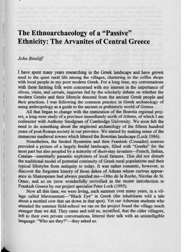 Një nga aspektet më interesante të artikullit është përshkrimi i asaj që Bintliff e quan “etni pasive”. Ndryshe nga sllavofonët e Greqisë Veriore, Arvanitët nuk shfaqin asnjë shenjë të një etnie asertive apo kërkesa politike. Ata e shohin veten si grekë “tipikë” në politikë dhe aspirata, por ruajnë me krenari të heshtur rrënjët e tyre.