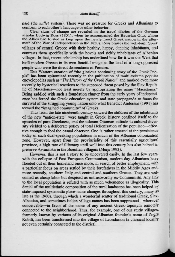 Artikulli i Bintliff është një thirrje për të njohur kompleksitetin e identitetit në Ballkan. Arvanitët e Boeotisë janë dëshmia e gjallë se pas një uniforme kombëtare homogjene fshihet një histori migrimi, autoktonie, përshtatjeje dhe bashkëjetese, ku shqipja ka shërbyer për shekuj si gjuha e heshtur e fushave dhe e maleve të Greqisë Qendrore.