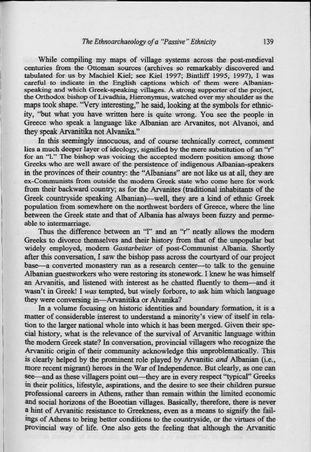 Arkeologu tregon një bisedë me Peshkopin e Livadhias, i cili bënte një dallim të prerë ideologjik: “Njerëzit këtu janë Arvanitë, jo Alvanoi (shqiptarë); dhe ata flasin Arvanitika, jo Alvanika.” Ky zëvendësim i shkronjës “L” me “R” shërben si një mjet distancimi social nga emigrantët e pas-komunizmit, duke i lejuar Arvanitët të mbeten pjesë e “komunitetit të imagjinuar” grek pa mohuar origjinën e tyre të lashtë.