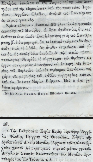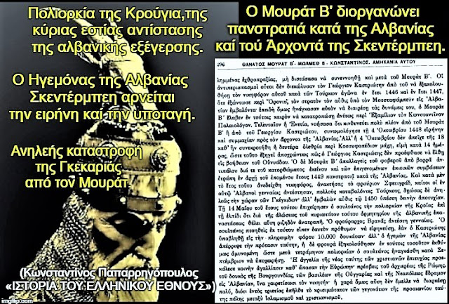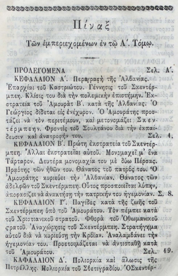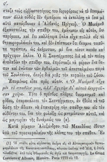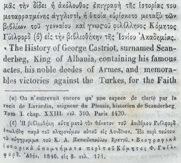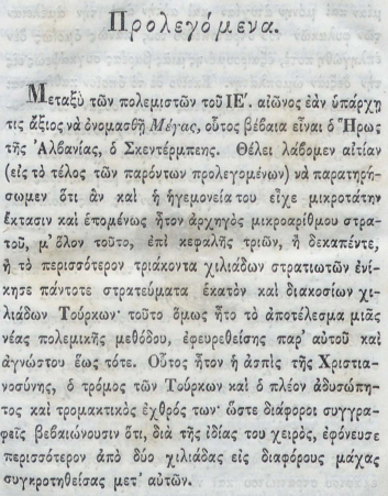 Nëse hedhim sytë mbi botimin monumental të vitit 1848 (Athinë), të titulluar “Γεώργιος Καστριώτης ο μετονομασθείς Σκεντέρμπεης, Ηγεμόνας της Αλβανίας” (Gjergj Kastrioti i mbiquajtur Skënderbe, Hegjemon i Shqipërisë), shohim se si akademia greke e asaj kohe e trajtonte figurën e tij. Në prolegomena (hyrjen) e këtij teksti grek (f. 9), bëhet një pohim që sot tingëllon si një leksion për revizionistët: