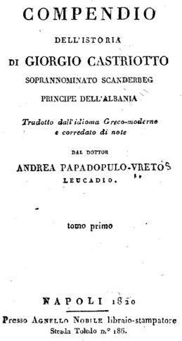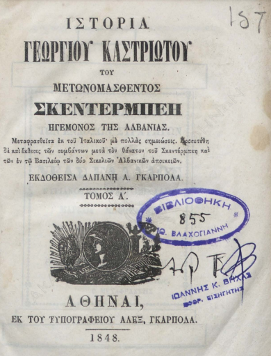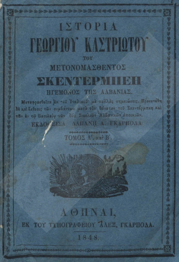 - Γεώργιος Καστριώτης ο μετονομασθείς Σκεντέρμπεης, Ηγεμόνας της Αλβανίας, Botuar nga Aleks. Ikariola, Athinë, 1848.