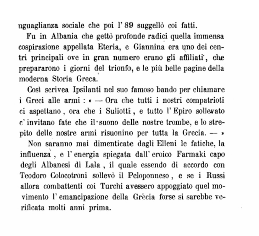 Dokumentet (fq. 144) përmendin edhe figura më pak të njohura por po aq heroike, si Farmaki, kreun e shqiptarëve të Lala-s, i cili në bashkëpunim me Teodor Kollokotronin ngriti peshë Peloponezin. Kjo dëshmon se kudo ku kishte një vatër zjarri për liri, aty gjendej një udhëheqës me gjak shqiptar, i stërvitur në disiplinën ushtarake që kishin sjellë nga shërbimet e tyre nën flamujt e Francës, Rusisë apo Anglisë.