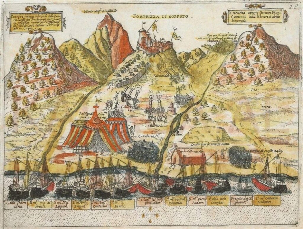 Në qershor të vitit 1570, Proveditori i Flotës Venedikase, Iacomo Celsi, i shkruante Michel Suriano-s mbi detajet e pushtimit të Sopotit. Dokumenti përshkruan një operacion kompleks ku morën pjesë “nëntë galea”, “1500 këmbësorë” dhe “70 kalorës”. Terreni përreth kalasë përshkruhet si tejet i vështirë: “vendi ishte malor, i pjerrët, plot shkëmbinj e ferra të dendura”.