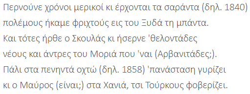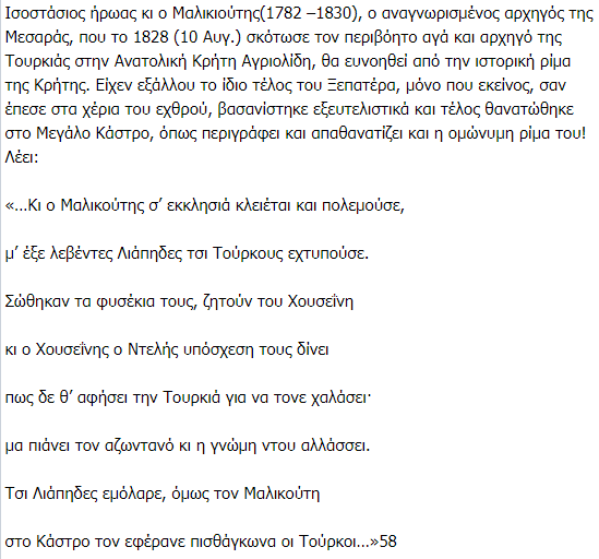 Një tjetër dëshmi prekëse vjen nga viti 1828 në Mesara të Heraklionit. Kapiteni kretas Malikoutis, pasi u ngrit kundër agait turk të zonës, u rrethua në një kishë. Gazeta kretase “PATRIS” ruan një rimë popullore të asaj kohe, e cila përshkruan momentet e fundit heroike të kapitenit, i cili nuk ishte vetëm, por i shoqëruar nga “gjashtë leventë lebër” (exi Leventes Liapides).
