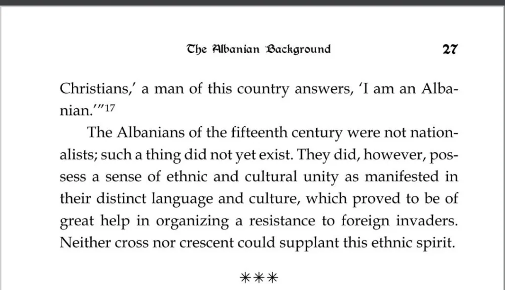 Qasje të ngjashme ndeshen edhe tek autorë si Fan Noli, në veprën “Historia e Skënderbeut, Kryezotit të Arbërisë (1405-1468) -1947, ku Skënderbeu përshkruhet si “mishërimi i një ndërgjegjeje kombëtare të parakohshme”, apo Franz Babinger, i cili e cilëson atë “një kampion të pavarësisë më shumë se të fesë”. Po kështu, C. E. Bosworth dhe Edwin Jacques theksojnë se udhëheqja e tij i kapërceu kufijtë fetarë, duke bashkuar një popull të përcaktuar nga gjuha dhe territori, jo nga besimi.