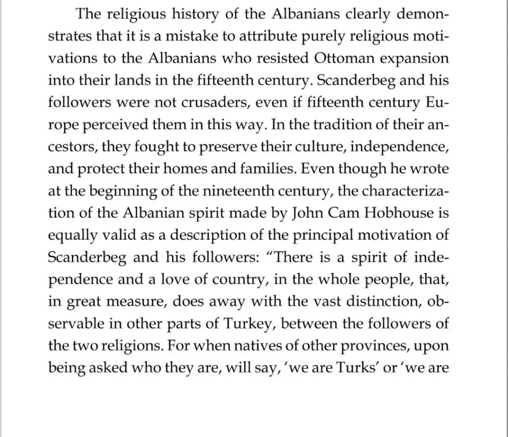 Kjo qasje gjen mbështetje edhe tek vëzhgimet e udhëtarit anglez John Cam Hobhouse, i cili në fillim të shekullit XIX shkruante se shqiptarët “frymëzohen nga një ndjenjë e fortë pavarësie dhe dashurie për vendin e tyre, e pranishme në të gjithë popullin.” Ky përshkrim, sipas Brackob, dëshmon vazhdimësinë e një ethosi të veçantë shqiptar – të ndërtuar mbi gjuhën, zakonet dhe besnikërinë ndaj truallit – i cili kishte qenë shtysa e vërtetë e kryengritjes së Skënderbeut.