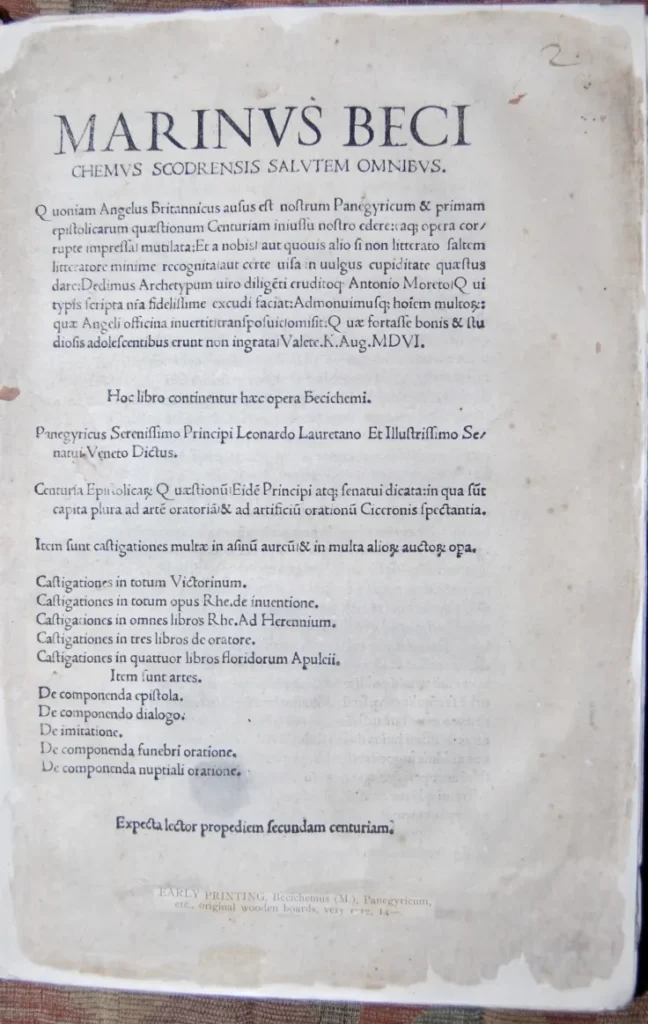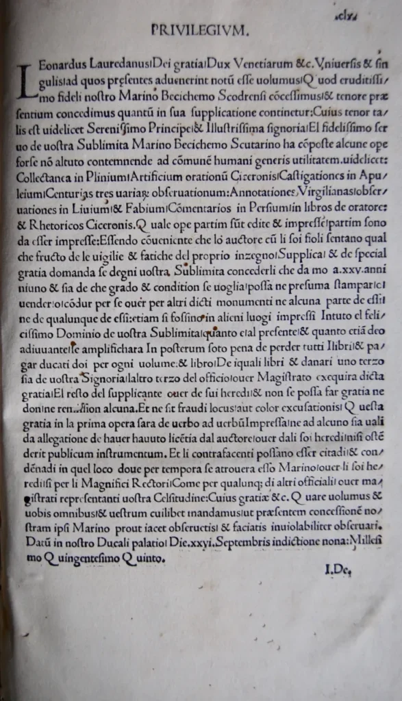 Imazhet e fundit të ofruara na njohin me një botim të rrallë venecian të vitit 1506 (MDVI), i shtypur nga Bernardino de’ Vitali. Ky vëllim është një përmbledhje monumentale e punës së tij, ku përfshihet “Panegyricus” – një fjalim lavdërues kushtuar Dozhës së Venedikut, Leonardo Loredanit, dhe Senatit Venedikas.