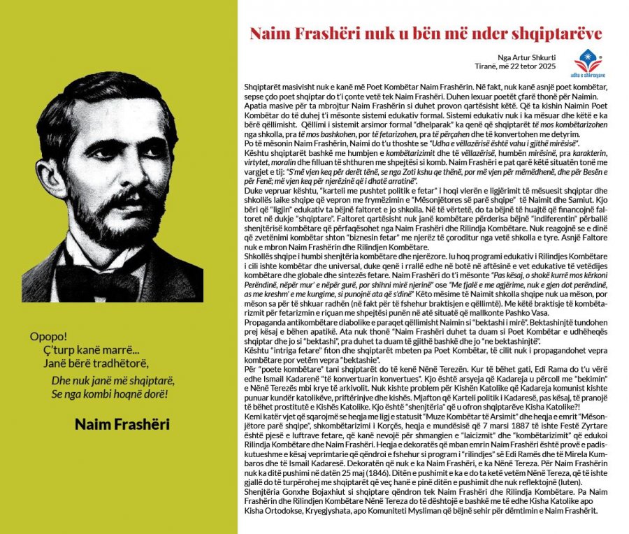 Titulli origjinal: Naim Frashëri nuk u bën më nder shqiptarëve / Nga Artur Shkurti – Drejtor i shkollës “Udha e shkronjave”