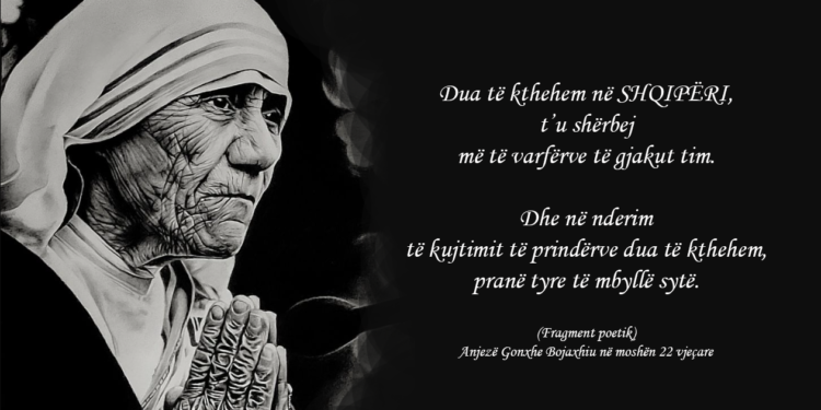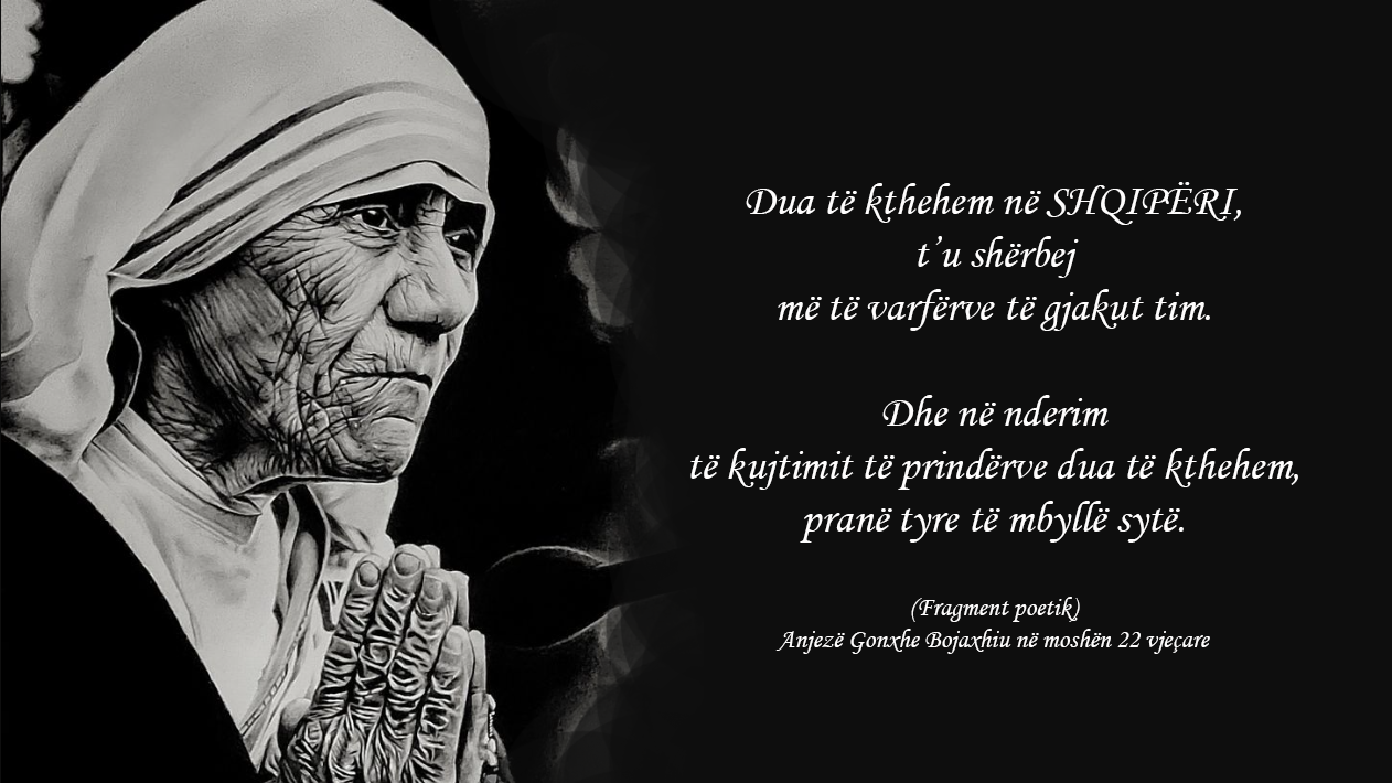 “Kam lindur në Shkup, jam shkolluar në Londër, jetoj në Kalkutë dhe punoj për të gjithë njerëzit e varfër në Botë. Atdheu im është një vend i vogël me emrin Shqipëri”.