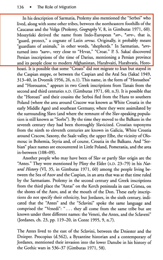 Në një tjetër studim të përmendur nga P. S. Sakac (1949), përmenden krahasime midis “Serboi” dhe fiseve të tjera indoiraniane të përmendura në mbishkrimet persiane të mbretit Darius, si Harahvati dhe Horouati, që përkojnë me rajonet e sotme të Harahvaitit (Afganistani jugor). Kjo përputhje e toponimeve, e bashkuar me dëshmitë arkeologjike, mbështet tezën se emri “Serb” ka origjinë kaukaziane dhe se pjesë të këtyre fiseve u zhvendosën drejt stepave të Evropës Lindore gjatë shekujve IV–VI të erës sonë.