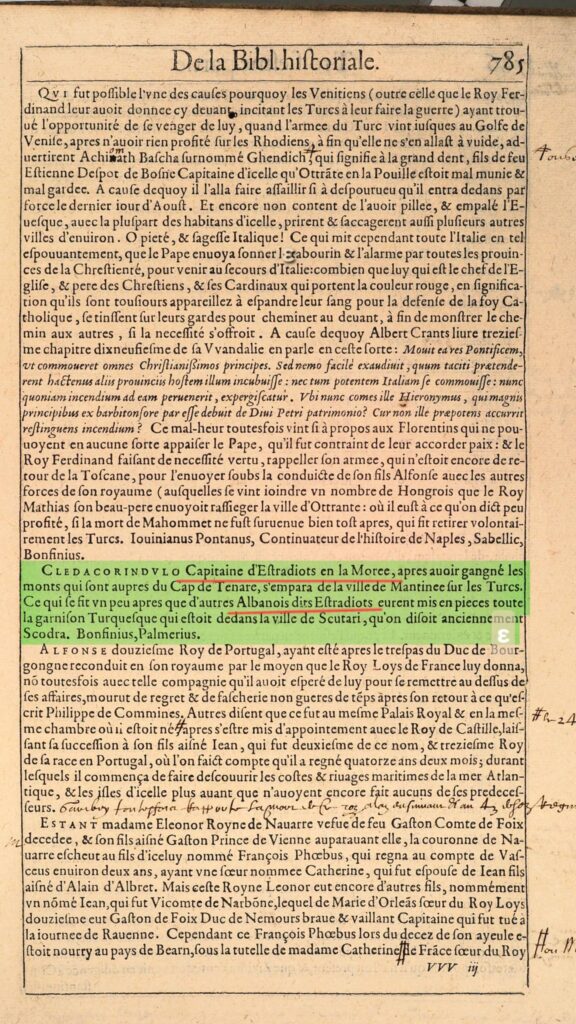Dokumenti tjetër (faqe 785) i referohet “Estradiots” (Stradiotëve), kalorësisë së lehtë shqiptare që la emër në të gjithë Evropën. Vignier përmend kapitenë si Cledacorindulo dhe aksionet e tyre në More (Peleponez) dhe Scutari (Shkodër), të cilën ai e citon me emrin antik Scodra.
