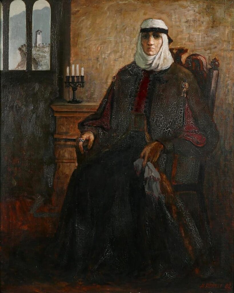 Vojsava Muzaka Kastrioti, the wife of Gjon Kastrioti, and the mother of the greatest Albanian national hero Gjergj Kastrioti Skanderbeg. Painting by Hysen Bengu (Devolli), 1982.