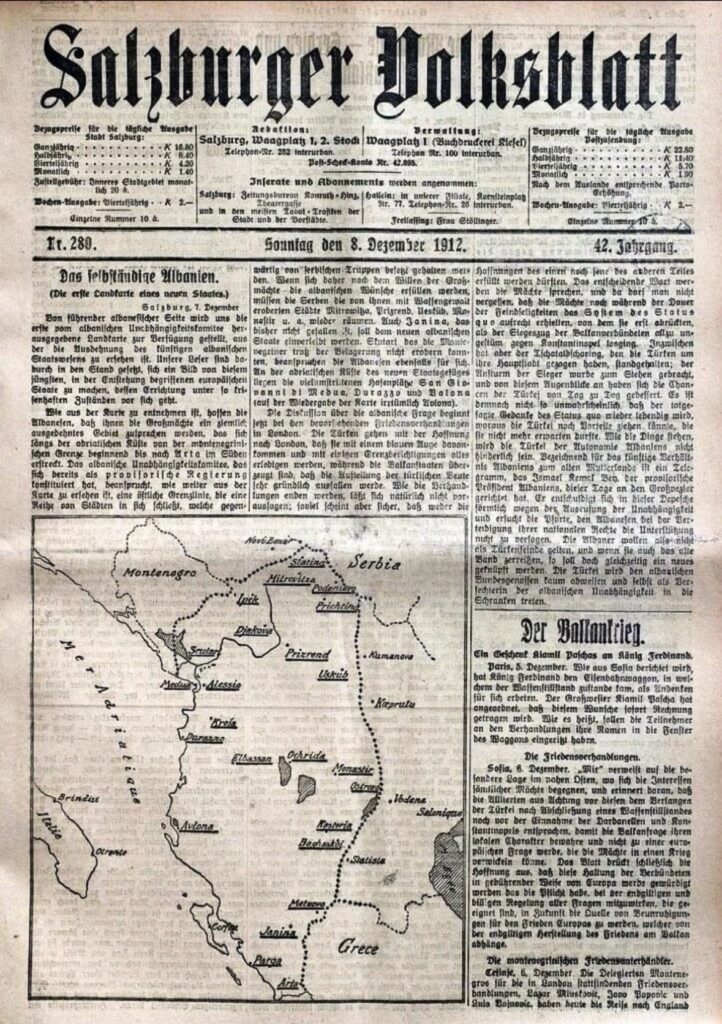 Në një moment kyç të historisë së Evropës Juglindore, gazeta austriake Salzburger Volksblatt, në numrin e saj të 8 dhjetorit 1912, i kushton një hapësirë të veçantë çështjes shqiptare, duke reflektuar jo vetëm interesin ndërkombëtar për fatin e trojeve shqiptare, por edhe një kuptim relativisht të saktë të shtrirjes etnike të shqiptarëve në prag të shpalljes së pavarësisë.